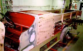 Vesley (seated) and Axalta's Mike Liccone (left) and Tim Peoples admire the '37 Ahrens-Fox fire engine, painted with Imron 6000. |