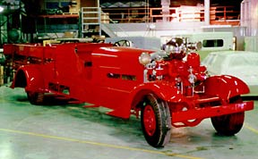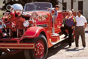 Vesley (seated) and Axalta's Mike Liccone (left) and Tim Peoples admire the '37 Ahrens-Fox fire engine, painted with Imron 6000. |
